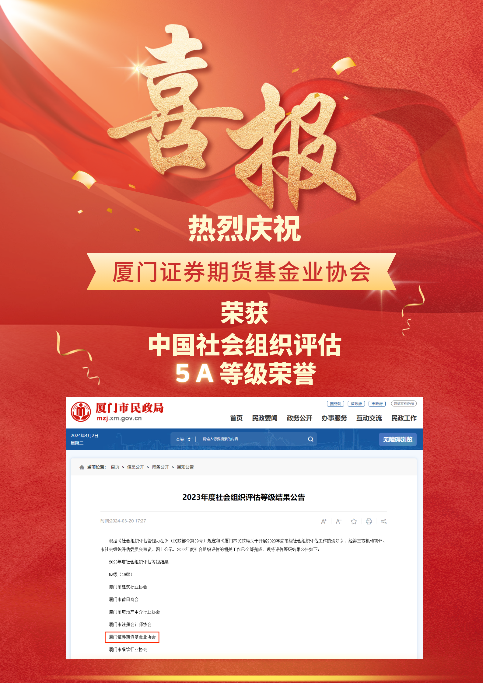 3月19日,厦门市民政局公布了2023年度社会组织评估等级结果公告,我会继2018年被获得5A级中国社会组织之后,又一次得到民政部门和专家评委的一致肯定,被评为5A级社会组织,为社会组织评估最高等级。