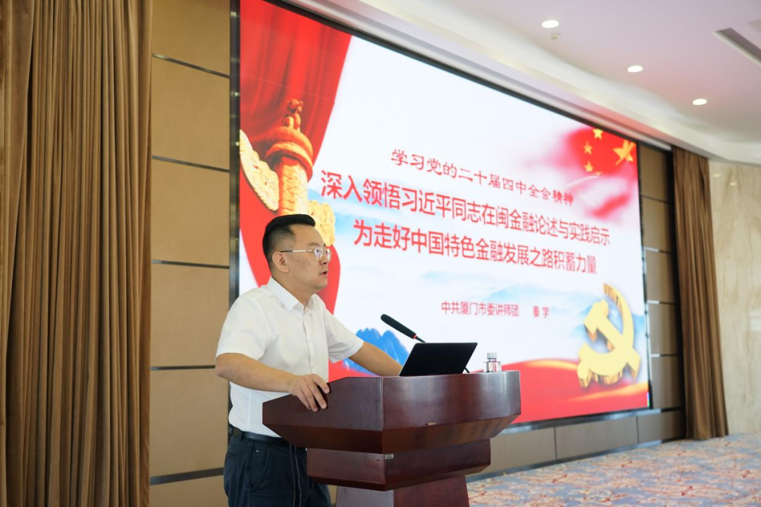 接着,中共厦门市委讲师团教研室主任秦学老师作“深入领悟习近平同志在闽金融论述与实践启示——为走好中国特色金融发展之路积蓄力量”专题讲座。秦主任以朱熹诗句“问渠那得清如许,为有源头活水来”为引,开门见山地分析了“两个确立”的决定性意义,并从坚持系统观念、立足实践需求、坚守底线思维、深化改革开放四个维度,深度阐释习近平同志对金融领域重大命题进行的深入研究、长远谋划和有益探索,以及由此诞生的一系列原创性思想、变革性实践、突破性进展和标志性成果。这些理论与实践成果,为开拓中国特色金融发展之路提供了源源不断的活水。秦主任的授课内容既深入浅出,又映照现实、贴近金融工作实际,揭示了习近平新时代中国特色社会主义思想在金融领域的实践伟力,引发与会人员强烈共鸣。大家纷纷表示,通过本次党课学习更深切体会到追寻习近平总书记福建足迹、厦门足迹,是我们学懂弄通做实习近平新时代中国特色社会主义思想的一把“金钥匙”。